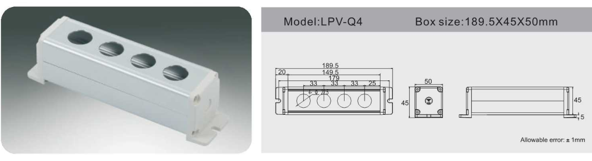 LPV / LPN Series aluminum terminal block enclosure is aluminum alloy, and the side panel material is corrosive engineering plastic, which has the characteristics of corrosion resistance and high strength. It can used as a control box for industries such as power transmission and distribution lighting.