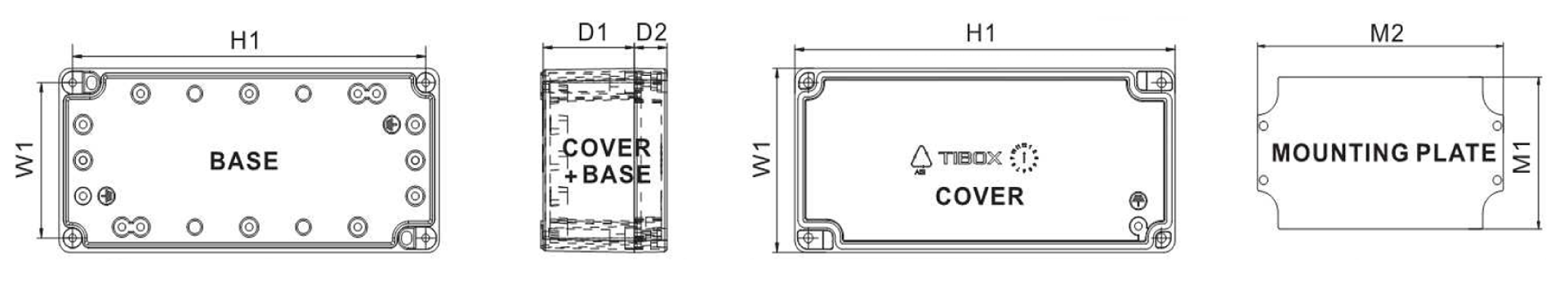 Size (mm) | Product Model | W1 | H1 | D1 | D2 | Plate Metal Model | M1 | M2 | Thinckness : Cover | Thickness : Base |